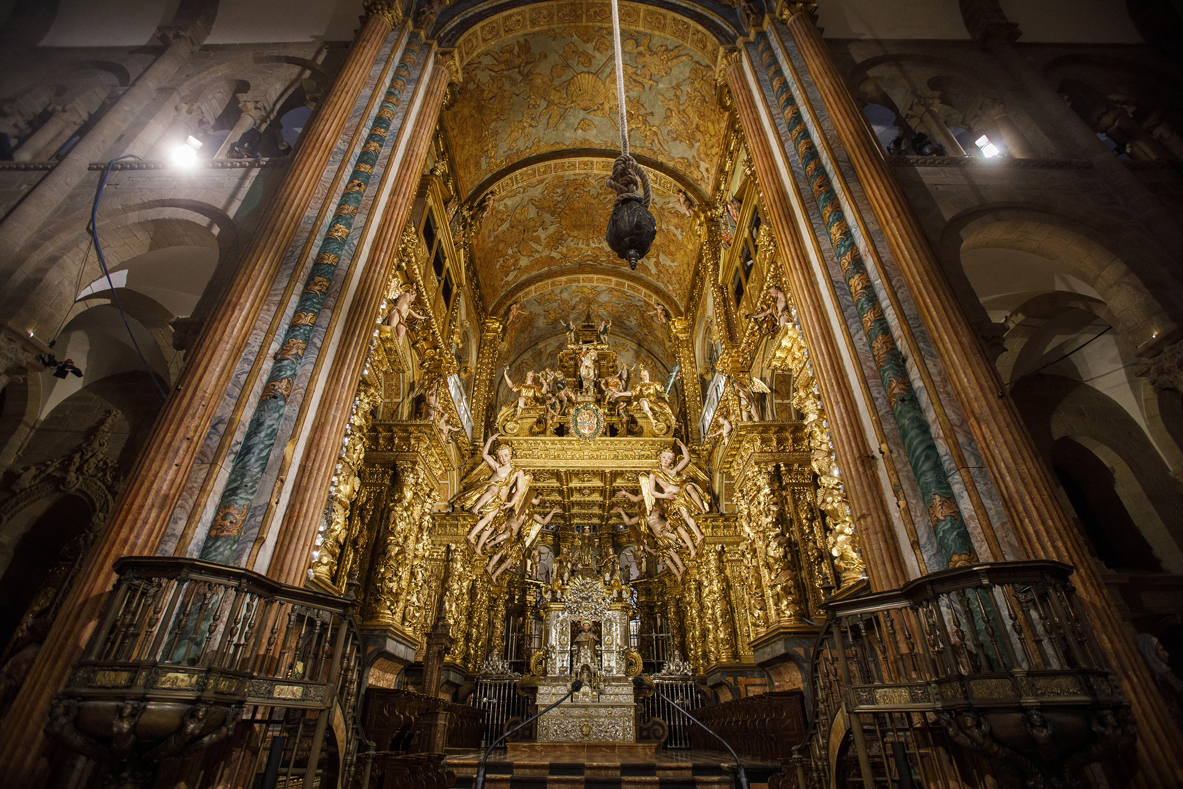 Una vez dentro, te sumergirás en la grandiosidad de su interior. Altos techos abovedados, impresionantes vidrieras y obras de arte sacro adornan el espacio, creando una atmósfera de solemnidad y devoción. El altar mayor, con su estatua del apóstol Santiago, es el corazón de la catedral y el objetivo final de la peregrinación.